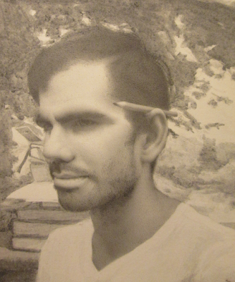 I placed some glassine paper over the portrait while doing the transfer to prevent graphite from getting on it. Then I filled in the shadow areas with graphite. After this I used powdered graphite to fill in large areas of value. For example the rock in the picture above.